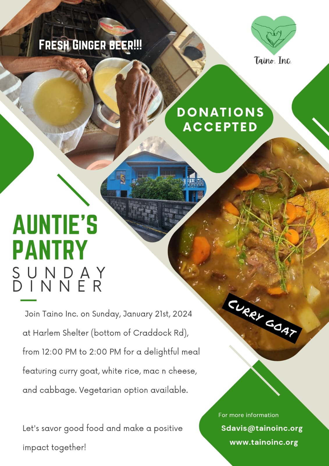 Join Taino Inc. on Sunday, January 21st, 2024 at Harlem Shelter (bottom of Craddock Rd), from12:00 pm to 2:00 pm for a delightful meal featuring curry goat, white rice, mac n cheese, and cabbage. Vegetarian option available. Let’s savor good food and make a positive impact together!